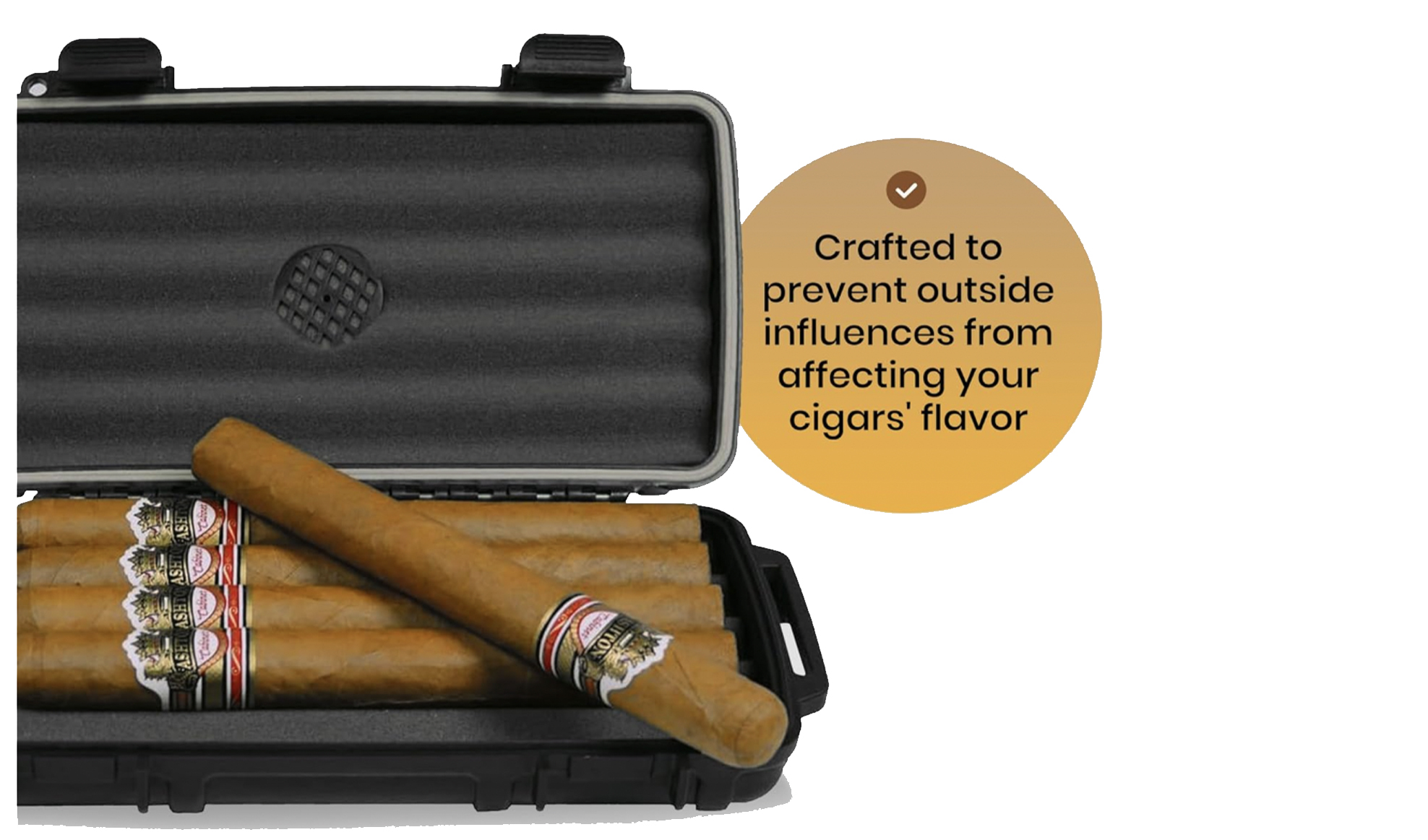 Safeguard your prized cigars with our gray crush-proof Travel Humidor. The foam interior provides cushioning to keep your cigars safe, making it the perfect choice for all your outdoor activities such as traveling, camping, and more. This humidor has a waterproof design, capable of enduring depths of up to 100 feet. It floats to protect your cigars, secured by two locking clasps. Its airtight seal preserves flavor and shields from air exposure.