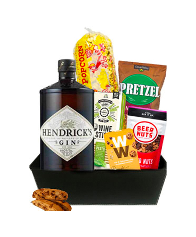 House of Gin comes in a reusable leather gift basketcontaining a bottle of Hendrick’s Gin, crackers, biscotti, pretzels, popcorn, nuts, and gourmet chocolate.