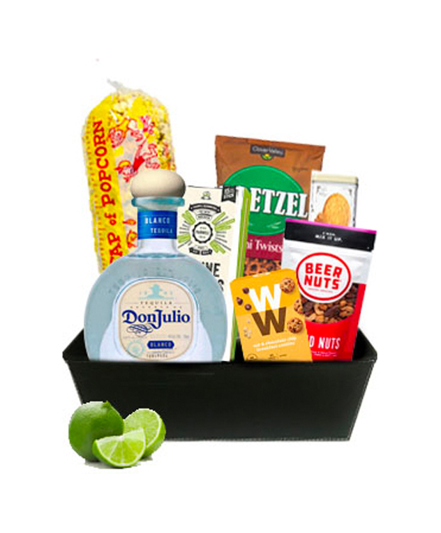 Margarita Madness contains a bottle of Don Julio Tequila, assorted chocolate, pretzels, cookies, caramel popcorn and biscotti on a unique leather gift basket.