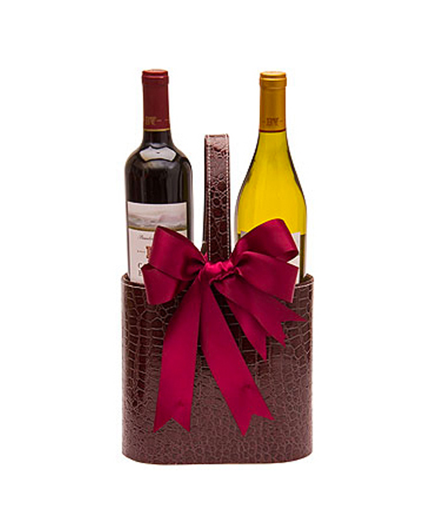 Two bottles of wines are presented in a faux leather wine tote.