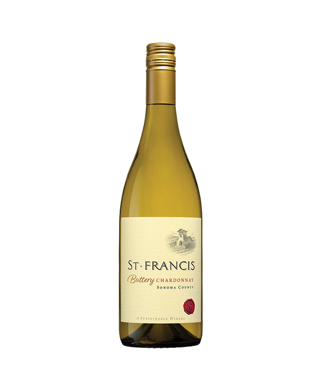 The grapes for St. Francis Sonoma County Buttery Chardonnay come from the warmer vineyards in Sonoma County, giving this wine tropical aromas. This Chardonnay has lower acidity with more new oak elements for added creaminess.