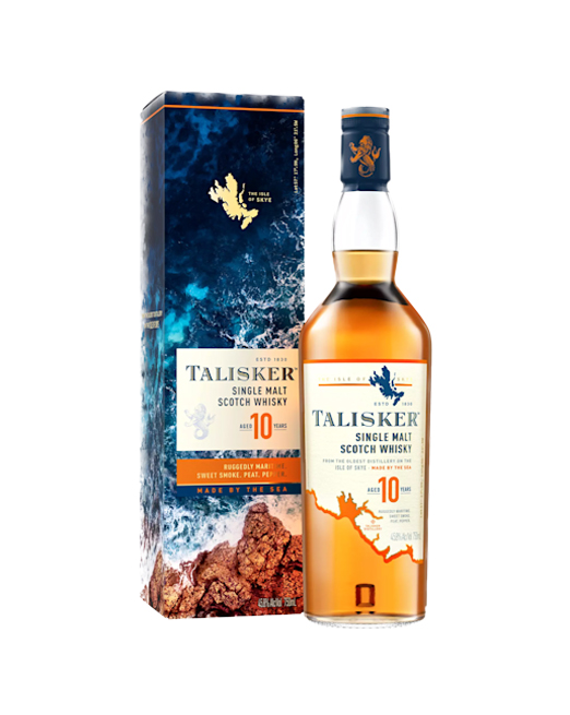 Produced at the oldest distillery on the Isle of Skye, Talisker Single Malt Scotch Whisky has been made by the sea since 1830, with its smell and taste instantly connecting you to its rugged maritime home. Every sip is a taste of the Isle of Skye itself, one of the most remote, windswept yet beautiful landscapes in Scotland. Talisker 10 Year Old, the stalwart of the Talisker family, is a powerful single malt whisky, with a sea-salty nose, spicy complexity, smoky sweet character and signature peppery finish: like a warm welcome from a wild sea. This single malt has a famously rich and powerful peat-smoke flavour, while the finish leaves you with a warm peppery taste at the back of the mouth.It is double distilled to create a rich, deep character embodying the maritime characteristics of a coastal whisky, and then aged for a minimum of 10 years in American oak casks. It is one of the most awarded single malt Scotch whiskies in the world including Double Gold medal winner at the San Francisco World Spirits Competition for four years in a row, including 2020. Talisker 10 Year Old makes a perfect present for adventurers who share the wild spirit of our founders, who rowed to the Isle of Skye in 1830 where Talisker has been distilled ever since.